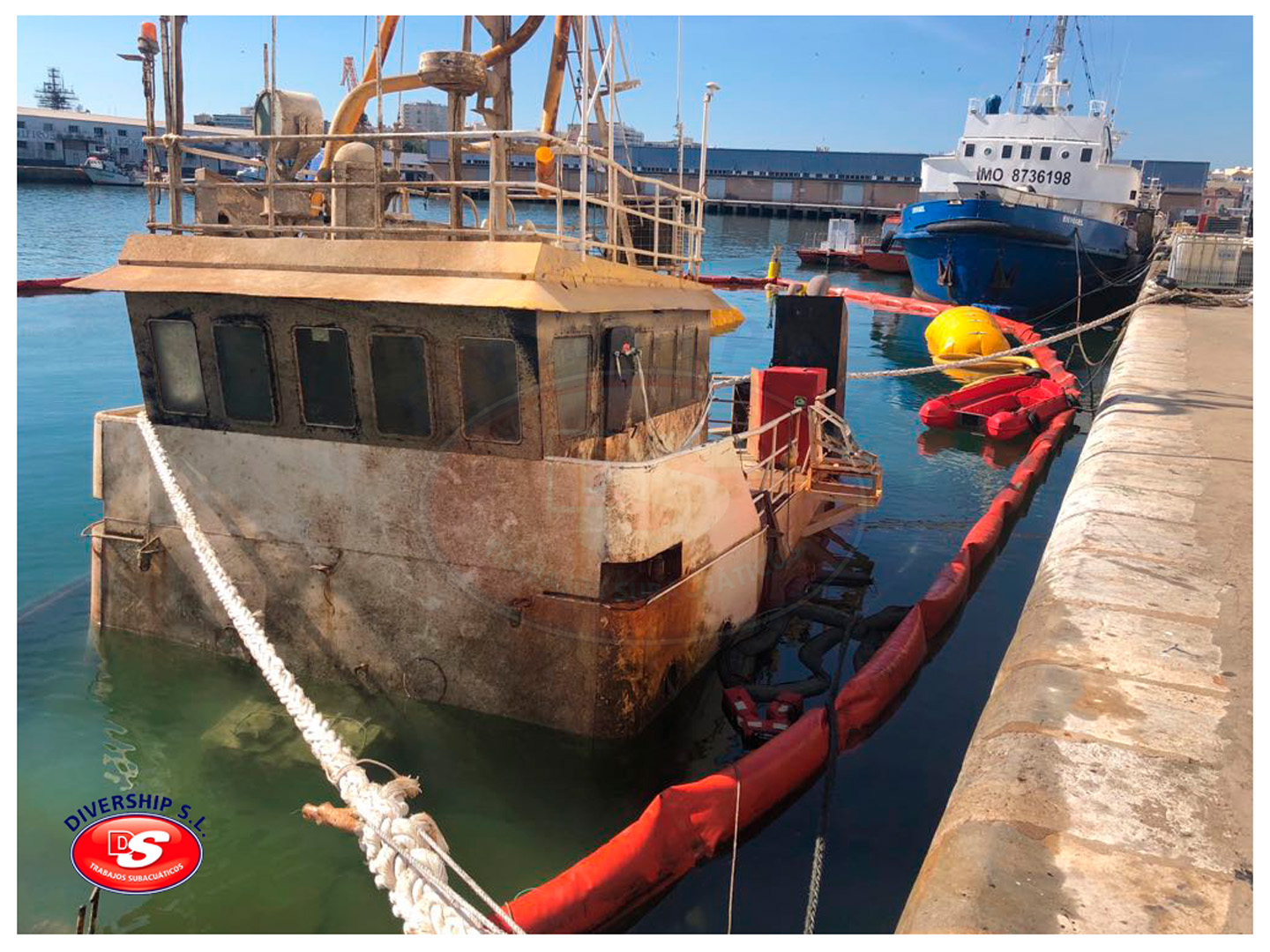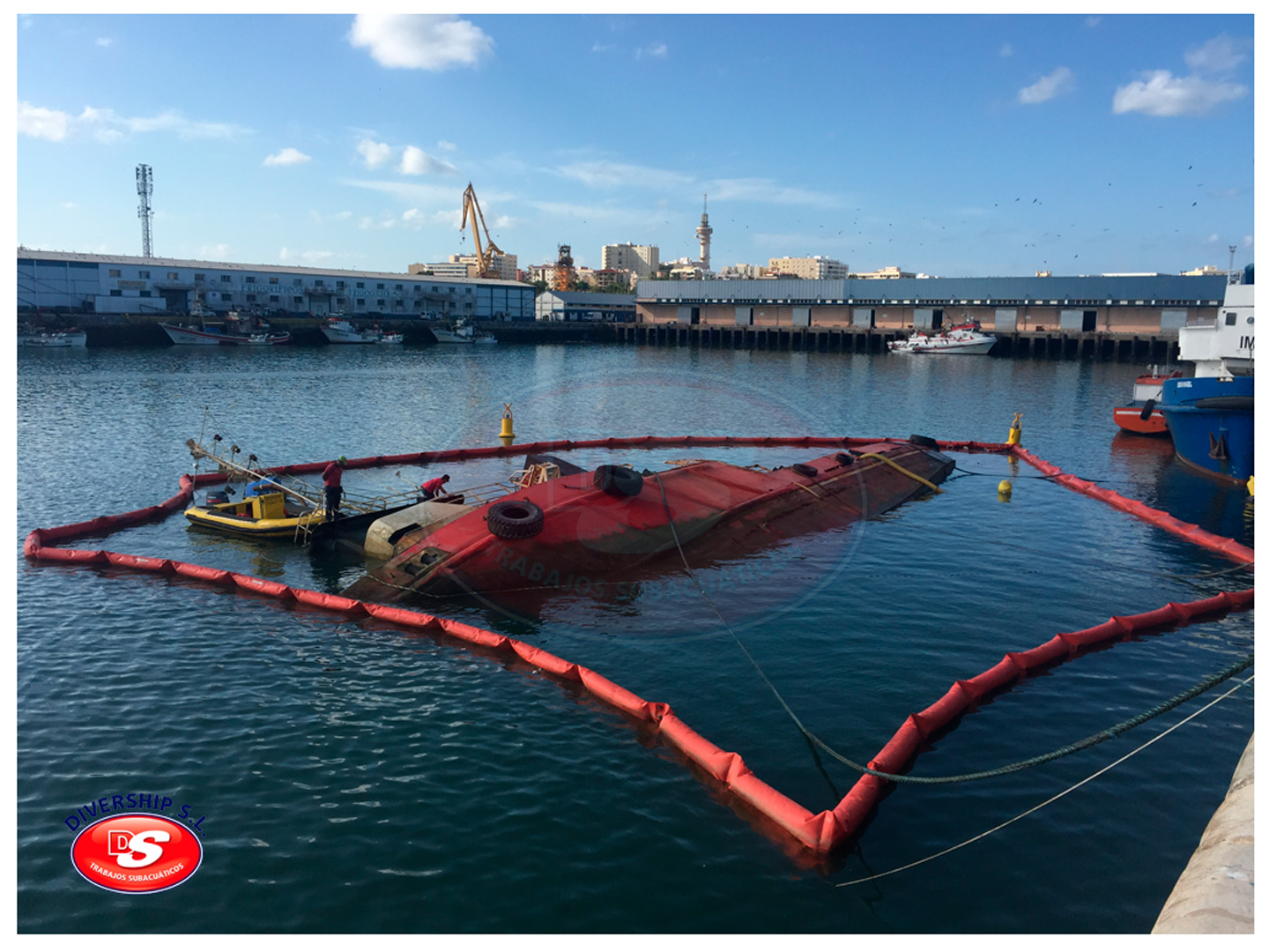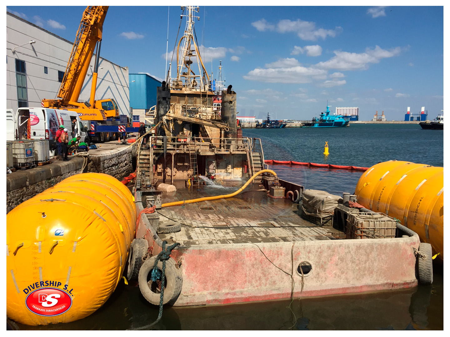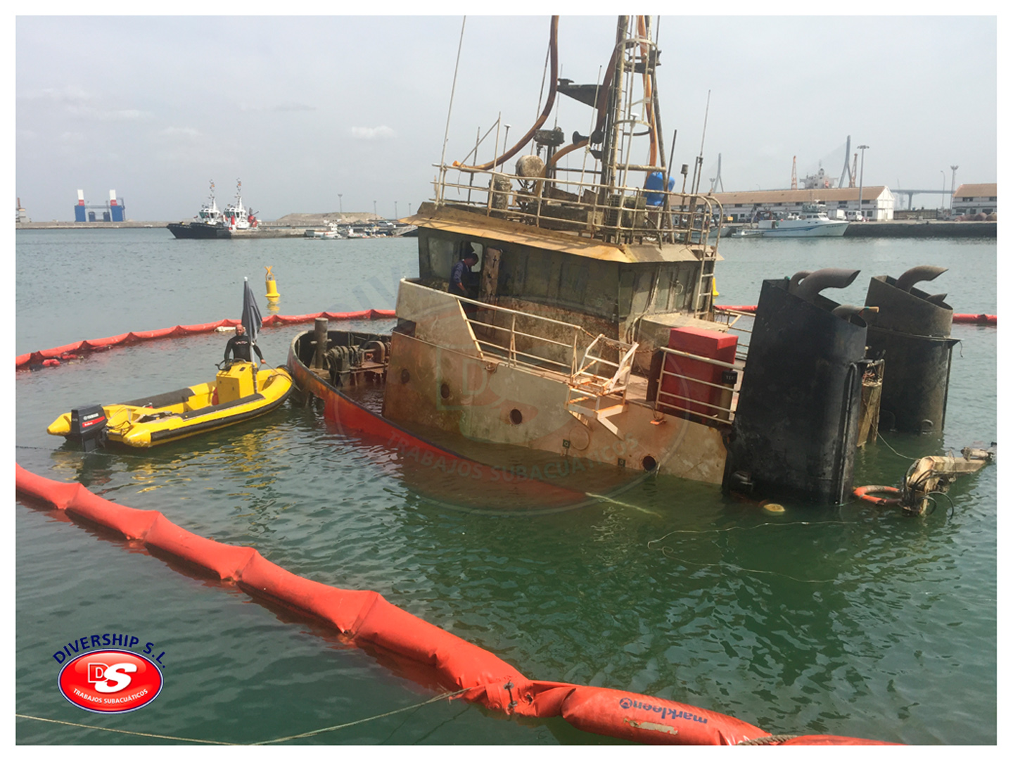 La Autoridad Portuaria Bahía de Cádiz encargó a DIVERSHIP SL Trabajos Subacuáticos el reflotamiento del del buque, y su posterior traslado a El Puerto de Santa María.