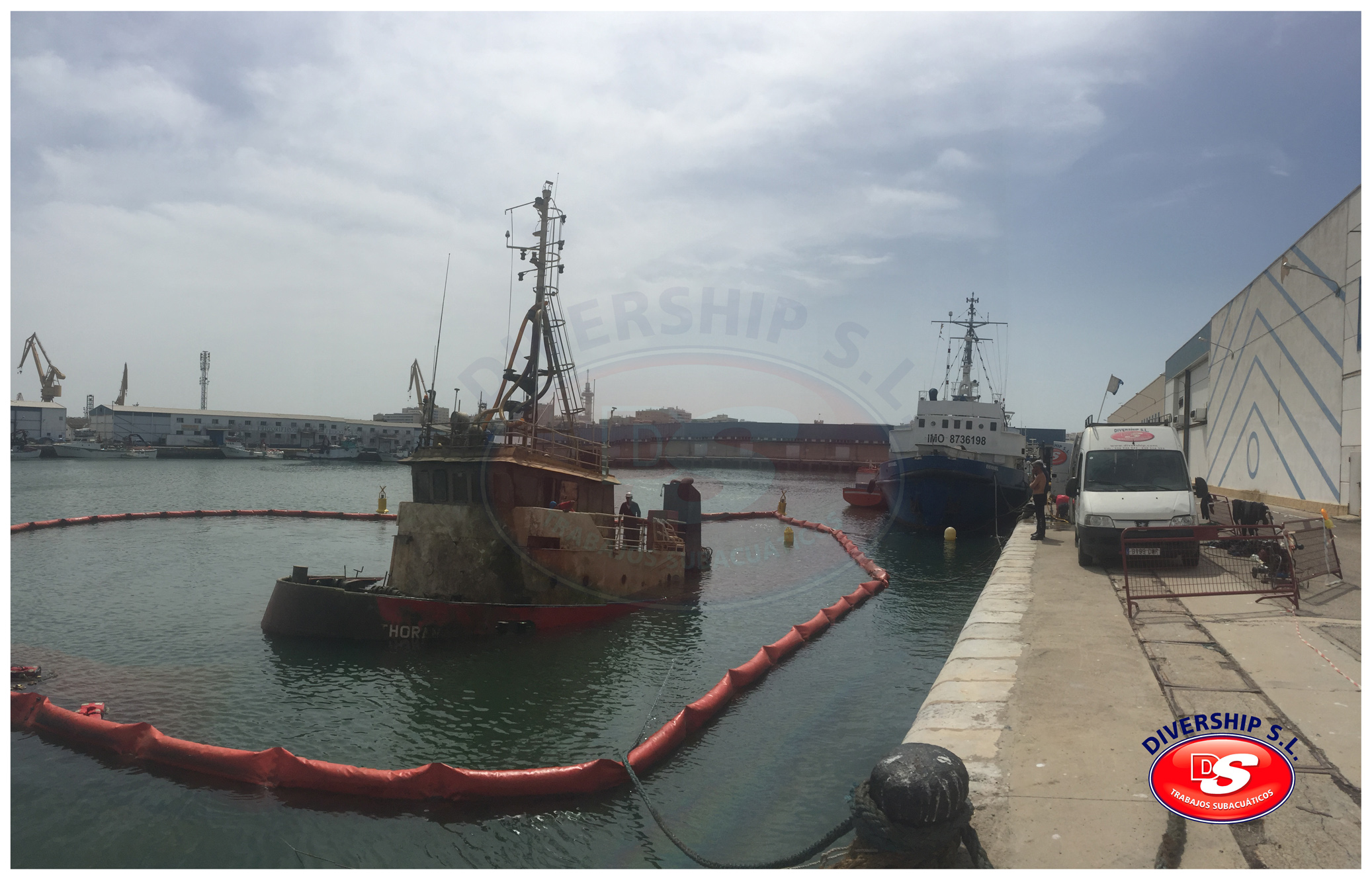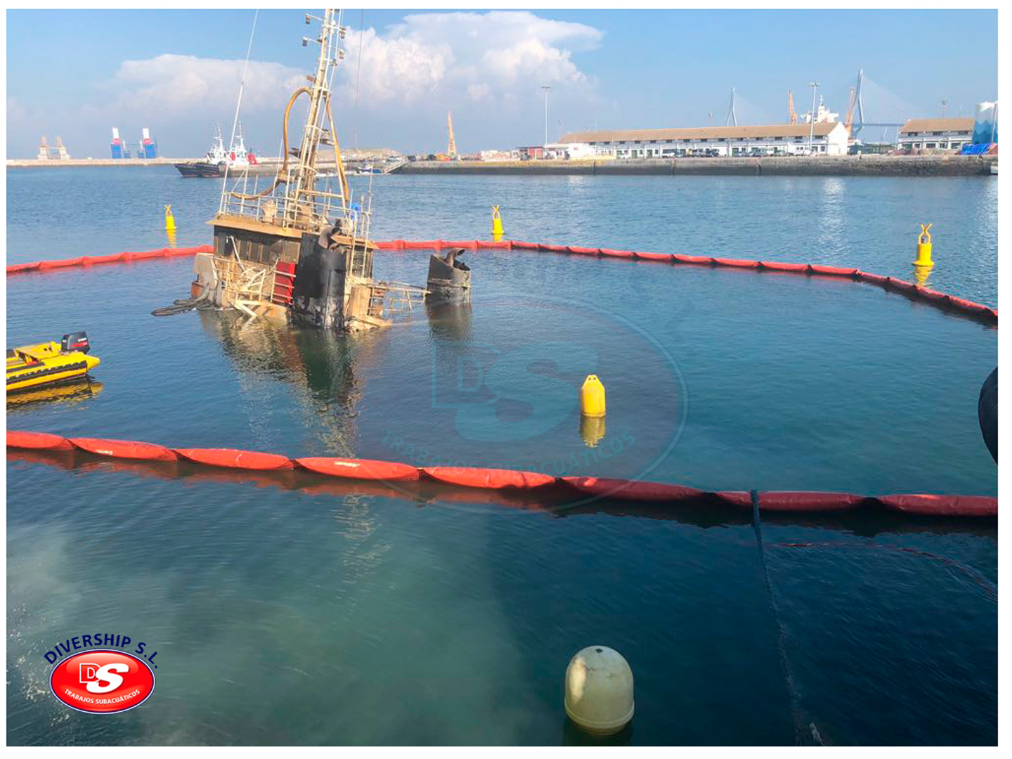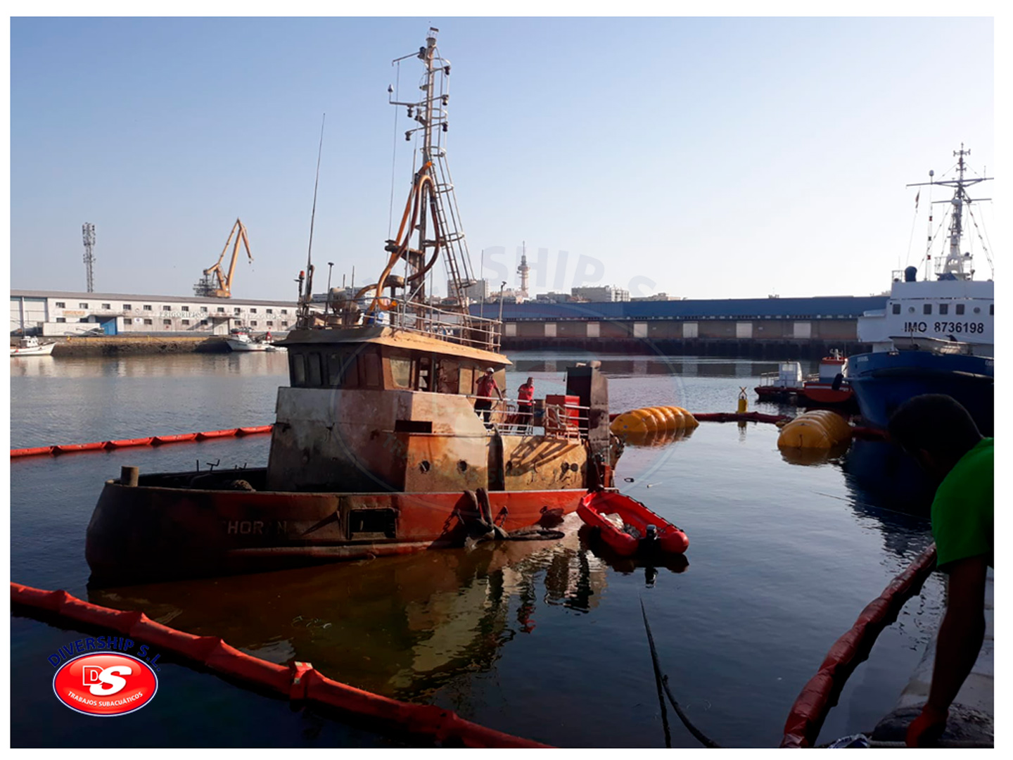 La Autoridad Portuaria Bahía de Cádiz encargó a DIVERSHIP SL Trabajos Subacuáticos el reflotamiento del del buque, y su posterior traslado a El Puerto de Santa María.