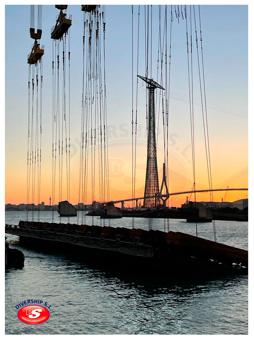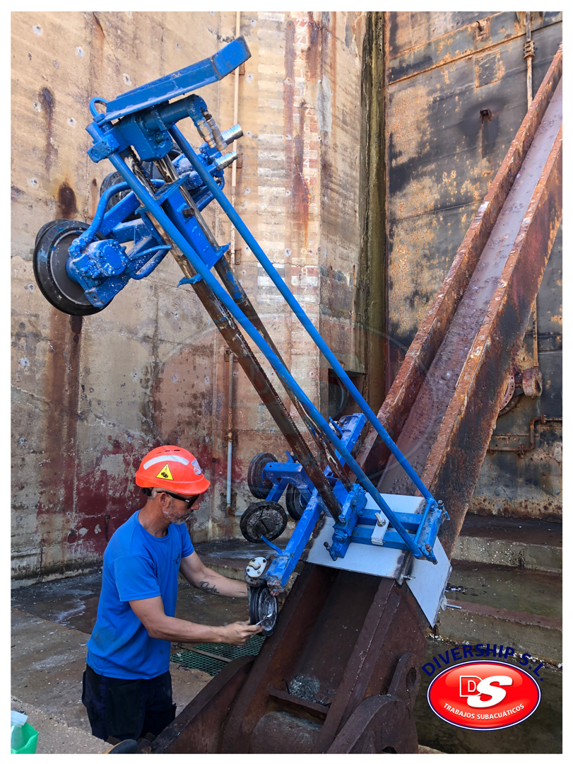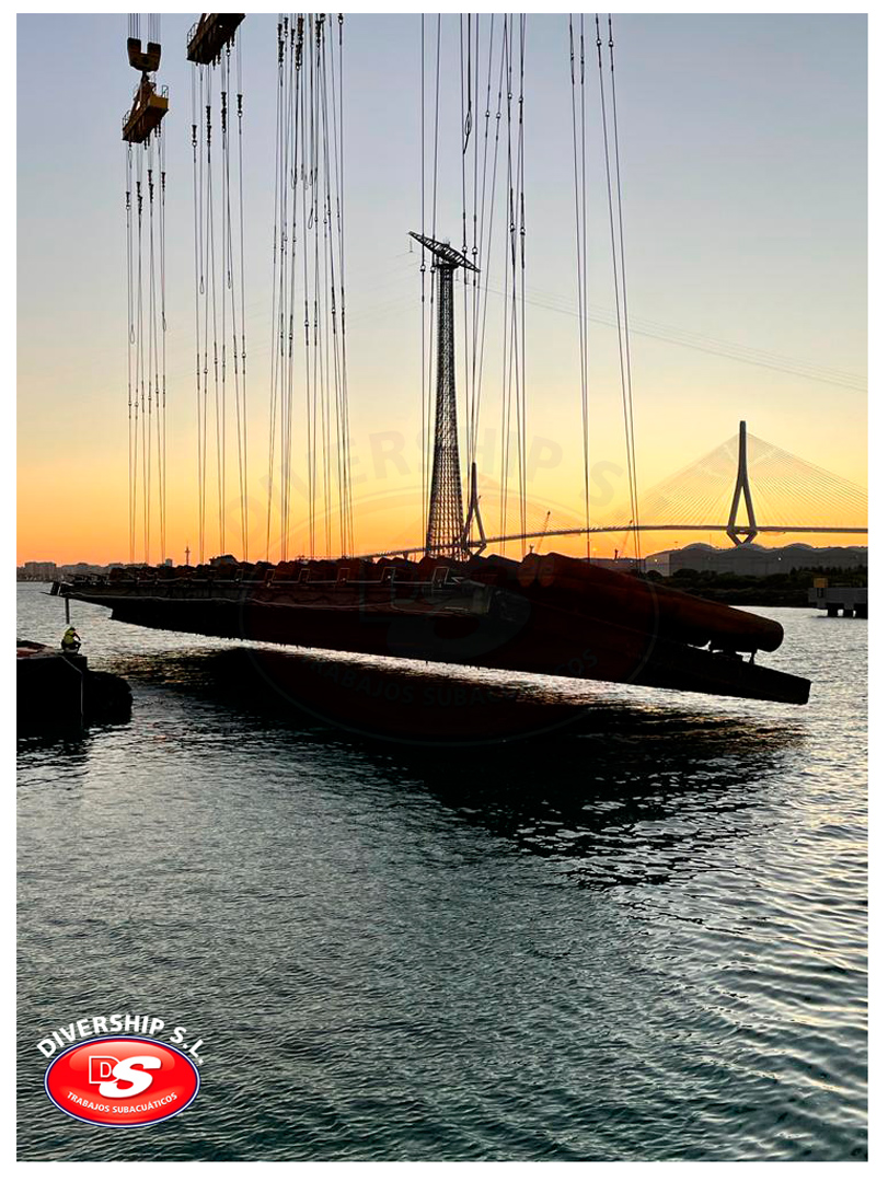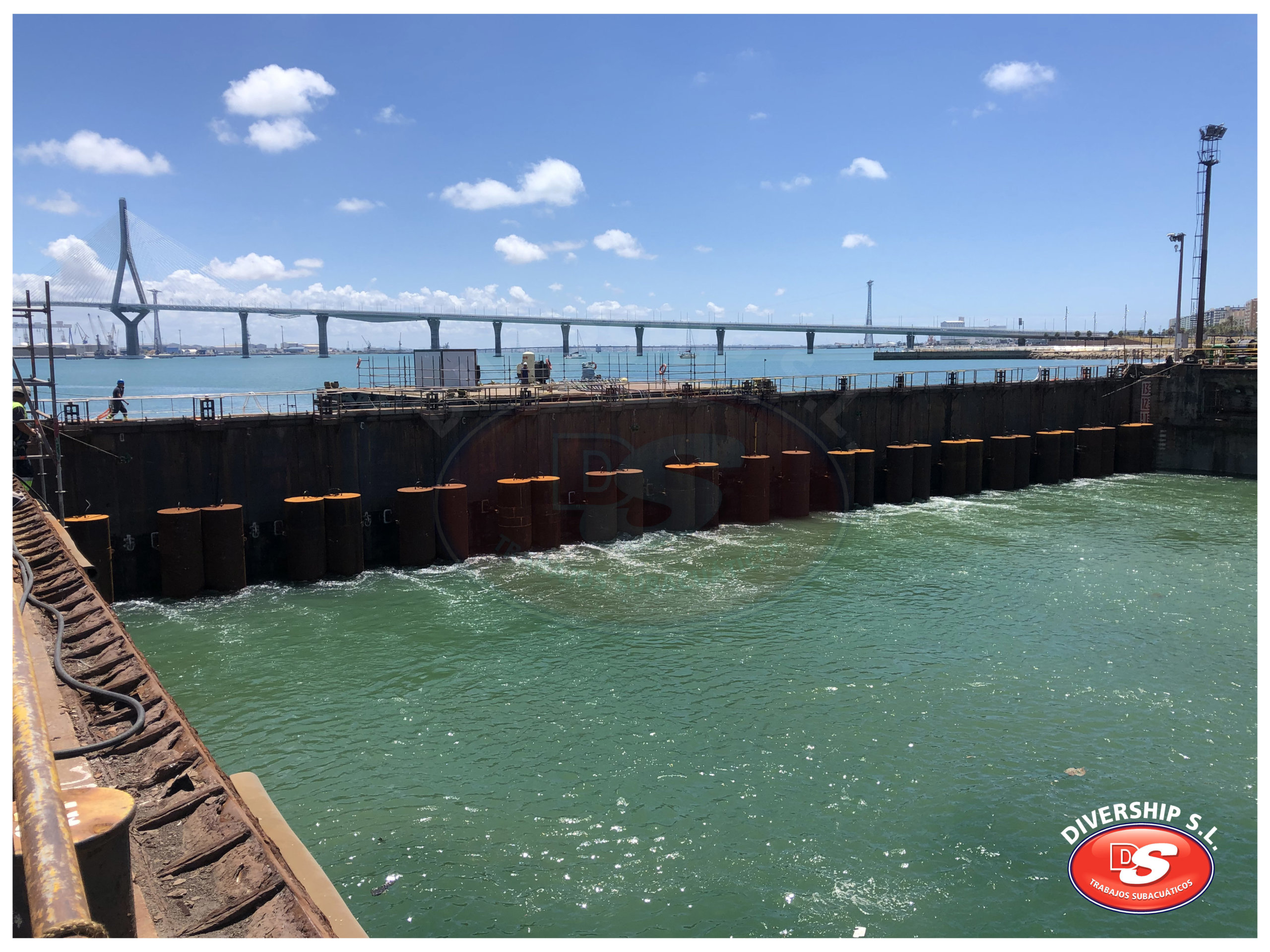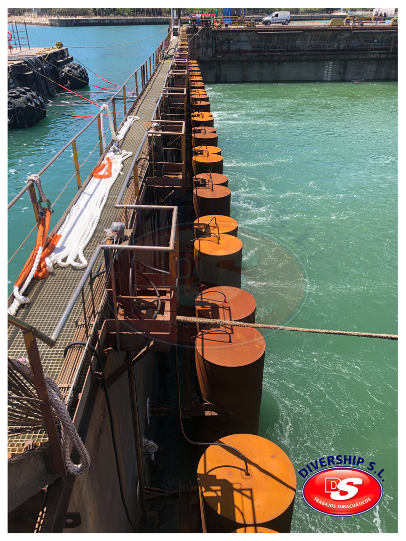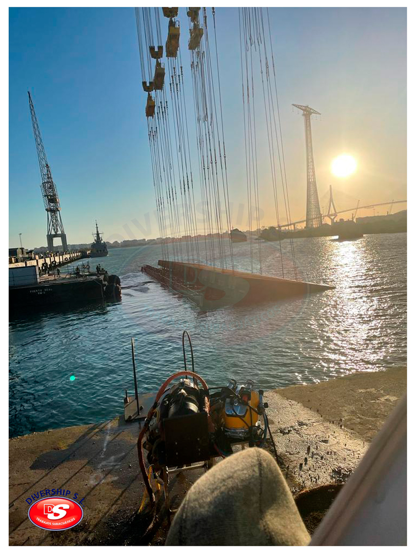 En verano del año 2022 Navantia Cádiz adjudicó a Divership SL Trabajos Subacuáticos la ejecución de los trabajos relativos a la retirada de los brazos existentes, así como a la instlación de los nuevos brazos y el apoyo a la instalación de la nueva compuerta.