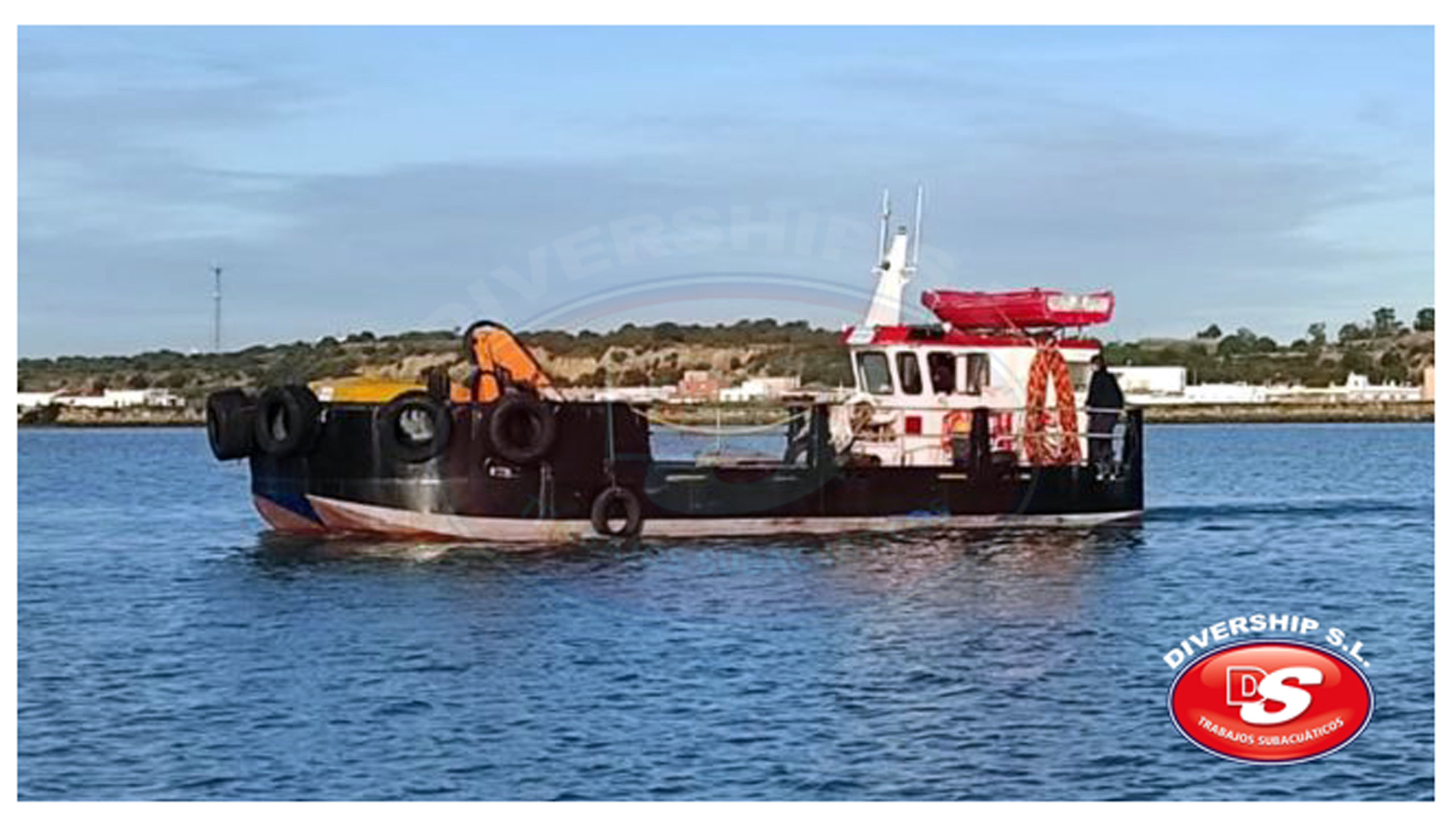 - Descripción: Embarcación con cubierta diáfana, que proporciona gran espacio de trabajo. Provista de Grúa marina con cabestrante hidráulico de cable de acero de 20 m.